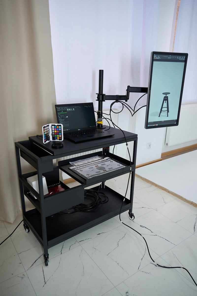 Cyklorama, ściana ze sztukaterią, regał z przydatnym sprzętem, wózek do tetheringu z laptopem i oprogramowaniem.